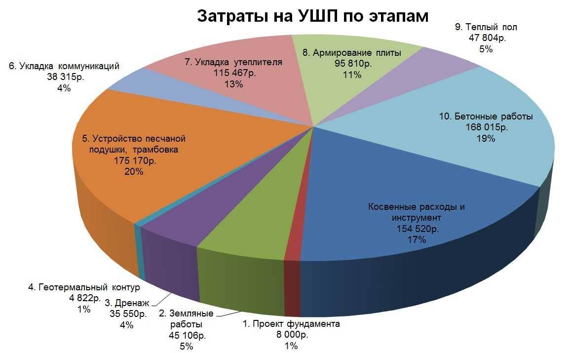 Так как инженерные системы оказываются залиты в толще бетона, она требует точного и грамотного расчета. Высокие требования предъявляются и к исполнению. Даже небольшие ошибки критичны. Делать УШП вы можете и сами, но проект лучше заказать. Примерный расклад по затратам смотрите в следующем фото. Суммы уже неактуальны, но процентное соотношение справедливо. Стоимость проекта фундамента составляет порядка 1%.