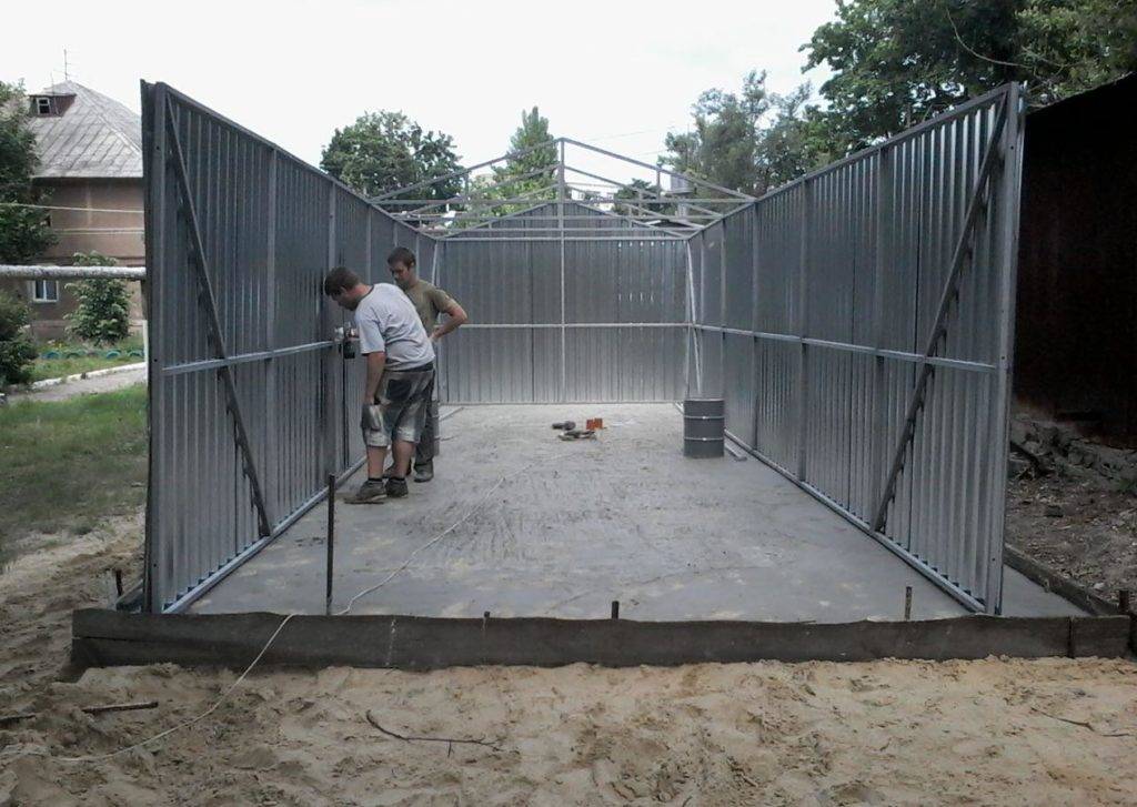 Установив все рамы, монтажные отверстия в фундаменте бетонируют, делают перерыв на несколько дней после чего приступают к обшивке гаража профнастилом. Его ставят вертикально для лучшего стока воды.