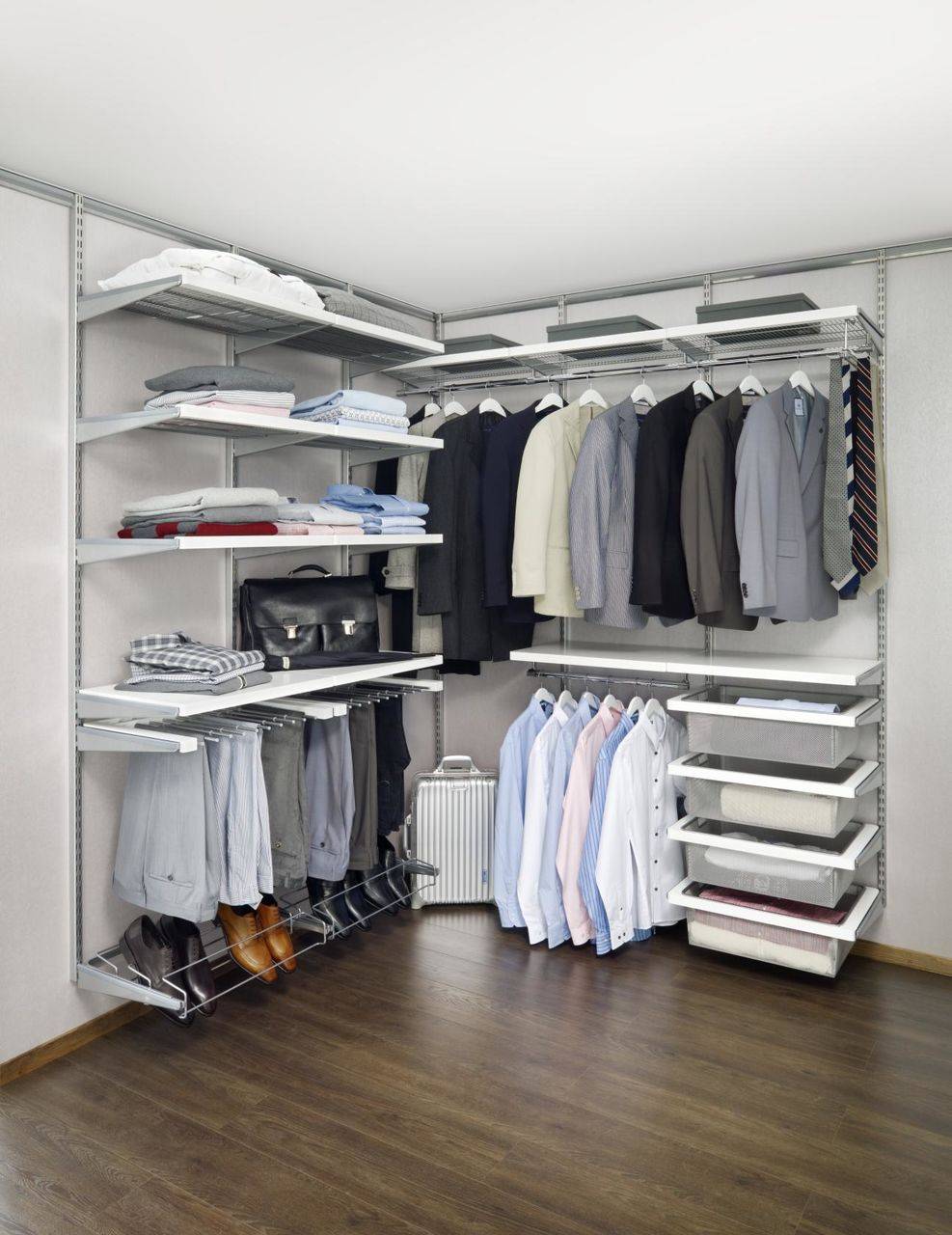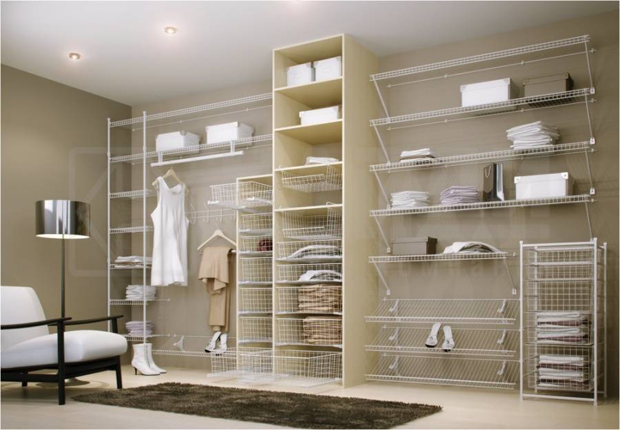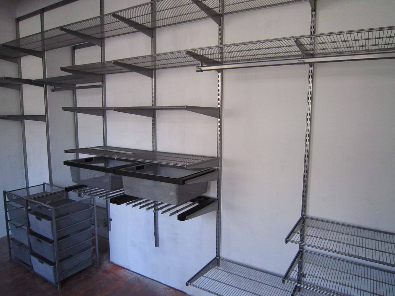 Достоинствами же стандартной сетчатой системы можно считать наличие специальных полозьев. С их помощью можно выдвигать полки и корзины. Конструкция позволяет время от времени проветривать вещи. Дополнительно клиенту предоставляются небольшие элементы, предназначающиеся в основном для хранения небольших по размерам вещей.