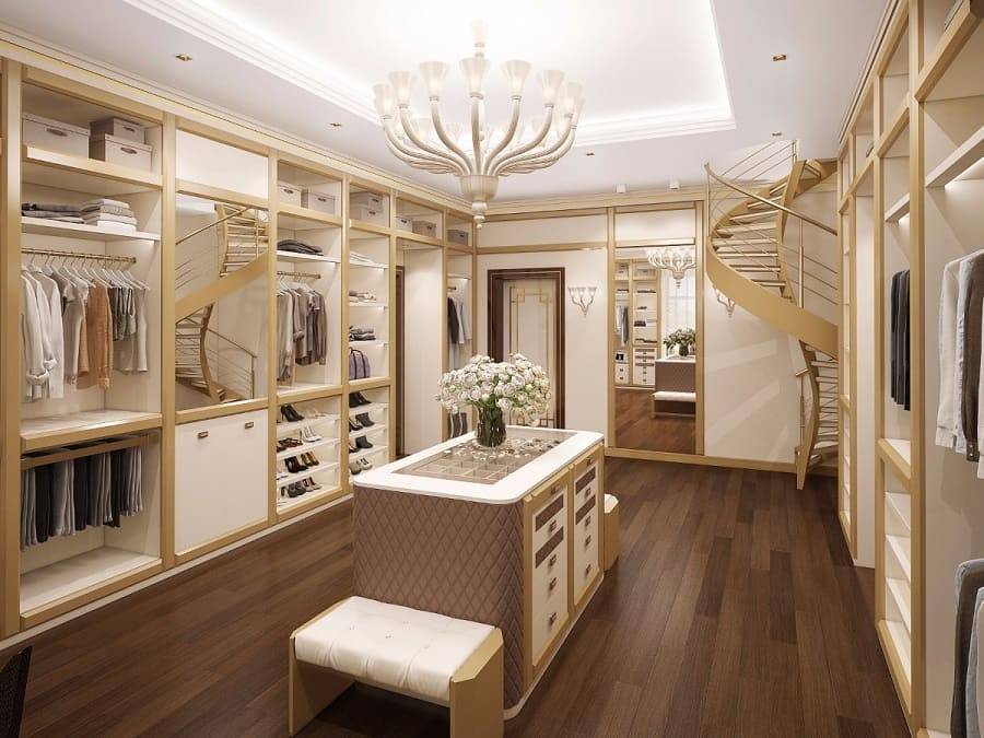 В последнее время разработчики по аналогии с дизайном кухонного пространства в своих дизайн-проектах обращаются к созданию интересных островных вариантов расстановки мебели в пространстве гардеробных.
