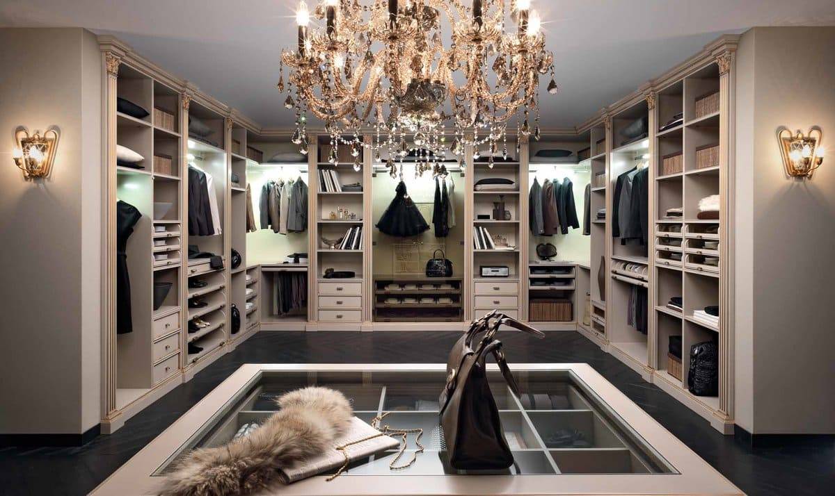 Остров в гардеробных комнатах небольших размеров может представлять собой миниатюрный комод, на который можно поставить сумки, шляпные коробки, шкатулки с украшениями. В гардеробных с большим количеством свободного пространства центром композиции может стать стеллаж со стеклянными полками или комод с выдвижными ящиками для мелких предметов гардероба и витриной с разложенными украшениями.