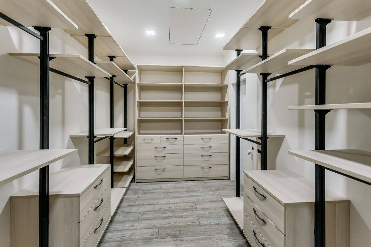 Большая и функциональная гардеробная комната со встроенным комодом и множеством полочек.