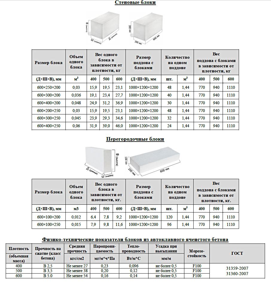 Ширина блоков, в зависимости от их назначения, начинается от 50 мм, и увеличивается у перегородочных изделий с кратностью 25 мм (75; 100; 125; 150), у стеновых – 50 мм (200; 250; 300). Исключением является 375 мм, который предлагается вместо 350 мм. Самые большие – 400 и 500 мм.