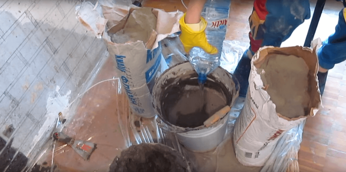 Замешивать раствор удобно дрелью, оборудованной специальной насадкой. Крайний вариант — вручную. На пол желательно расстелить клеёнку: хоть вы предельно аккуратны, не удастся избежать грязи.