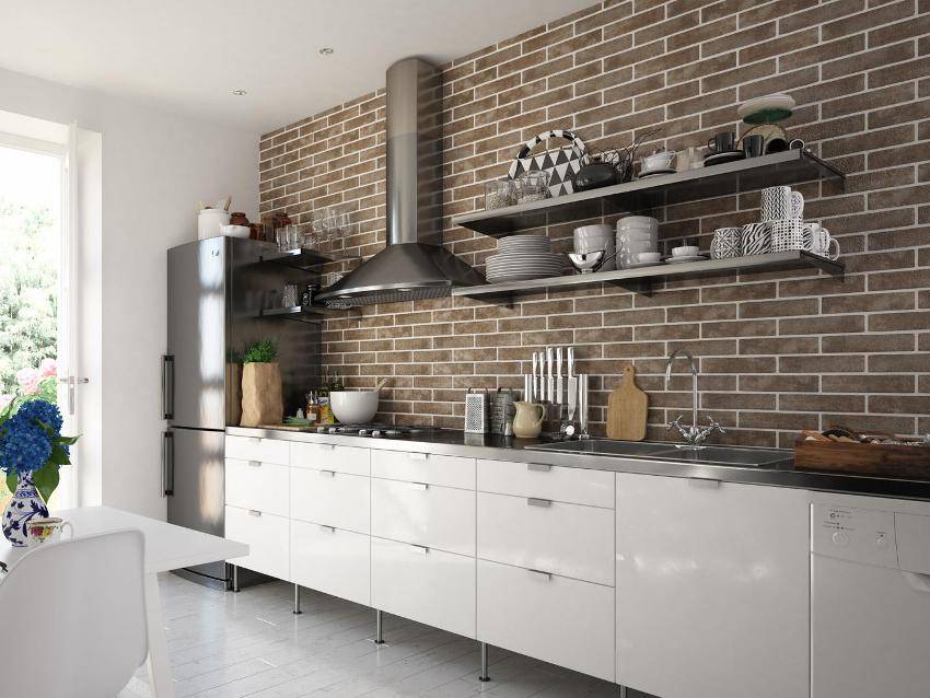 Плитка под кирпич эффектно смотрится при оформлении кухонного фартука
