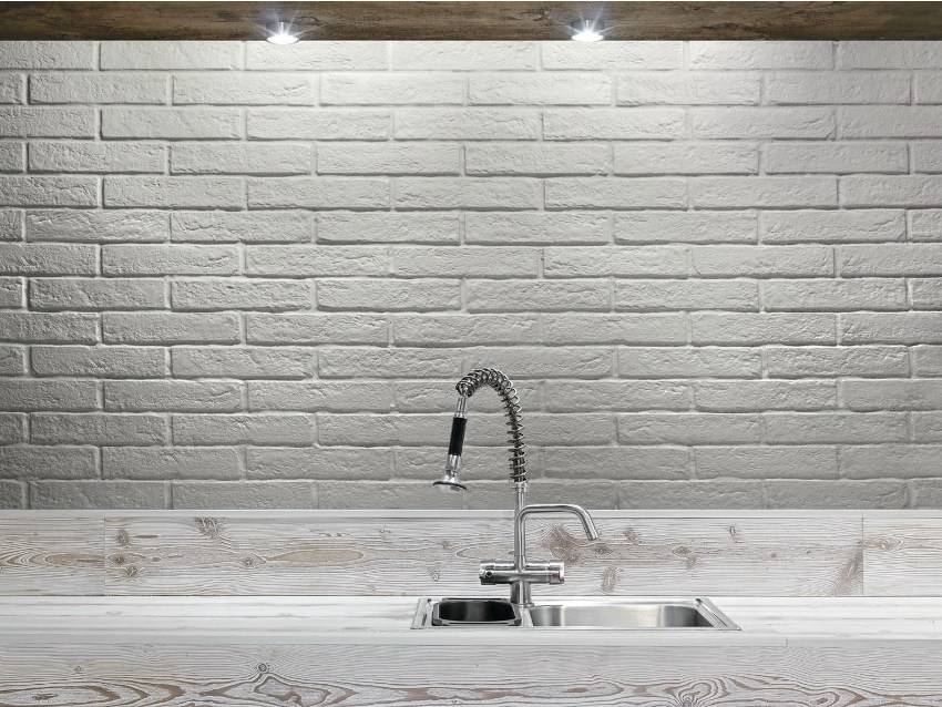 На фото кухня и рабочая зона с гипсовой плиткой с имитацией кирпича.