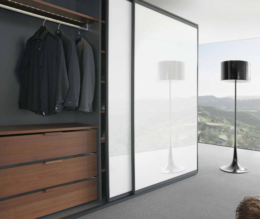 - Шкафы с раздвижными дверями часто устанавливают в спальне. Их основное предназначение – хранение одежды.