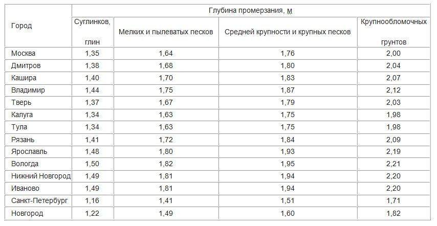 Глубина промерзания. Следует учитывать водонасыщенность грунта, а также его плотность;