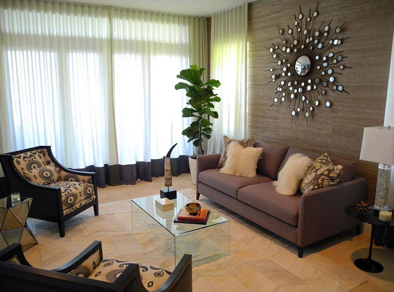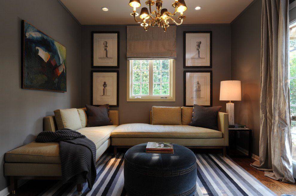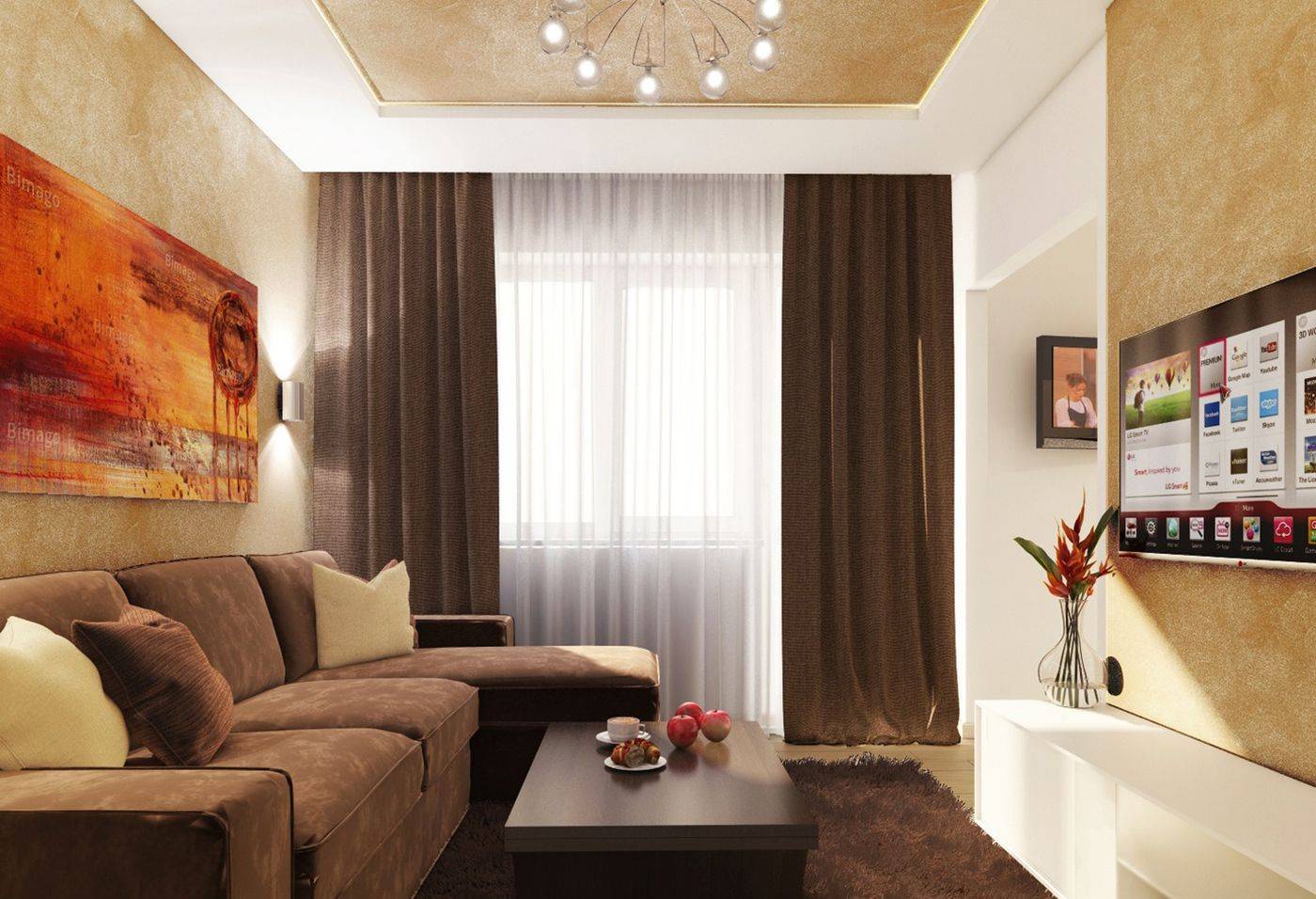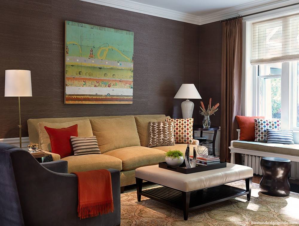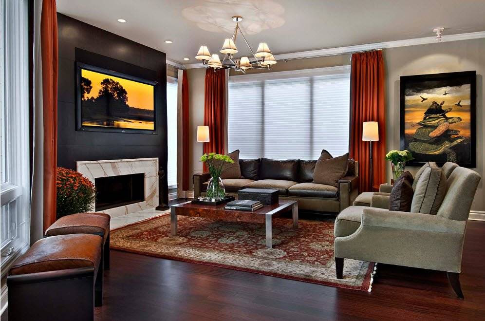 Столь же мягким выглядит интерьер в коричневых тонах. Кроме натуральности, такой цвет придает гостиной шик и роскошную атмосферу. Приятные шоколадные стены могут украсить комнату с хорошим освещением и достаточной площадью. Если желание использовать темные оттенки велико, то рекомендуется сначала выкрасить стены, а потом подбирать остальные объекты обстановки. На каждом этапе нужно анализировать свои ощущения от пребывания в гостиной. Если это место не кажется темным, то можно считать, что детали подобраны верно.