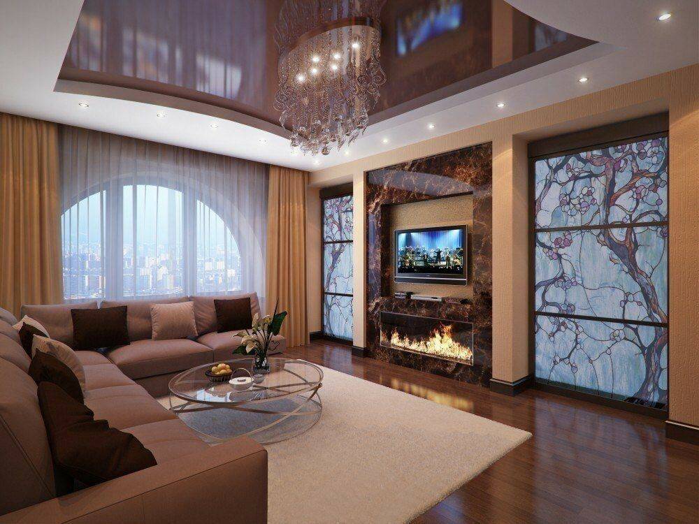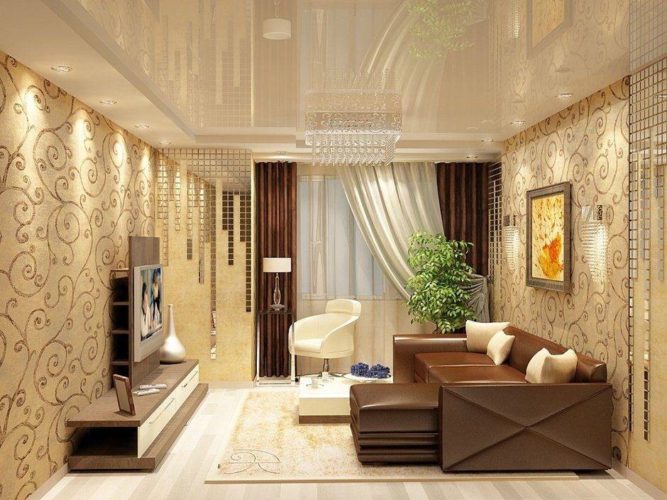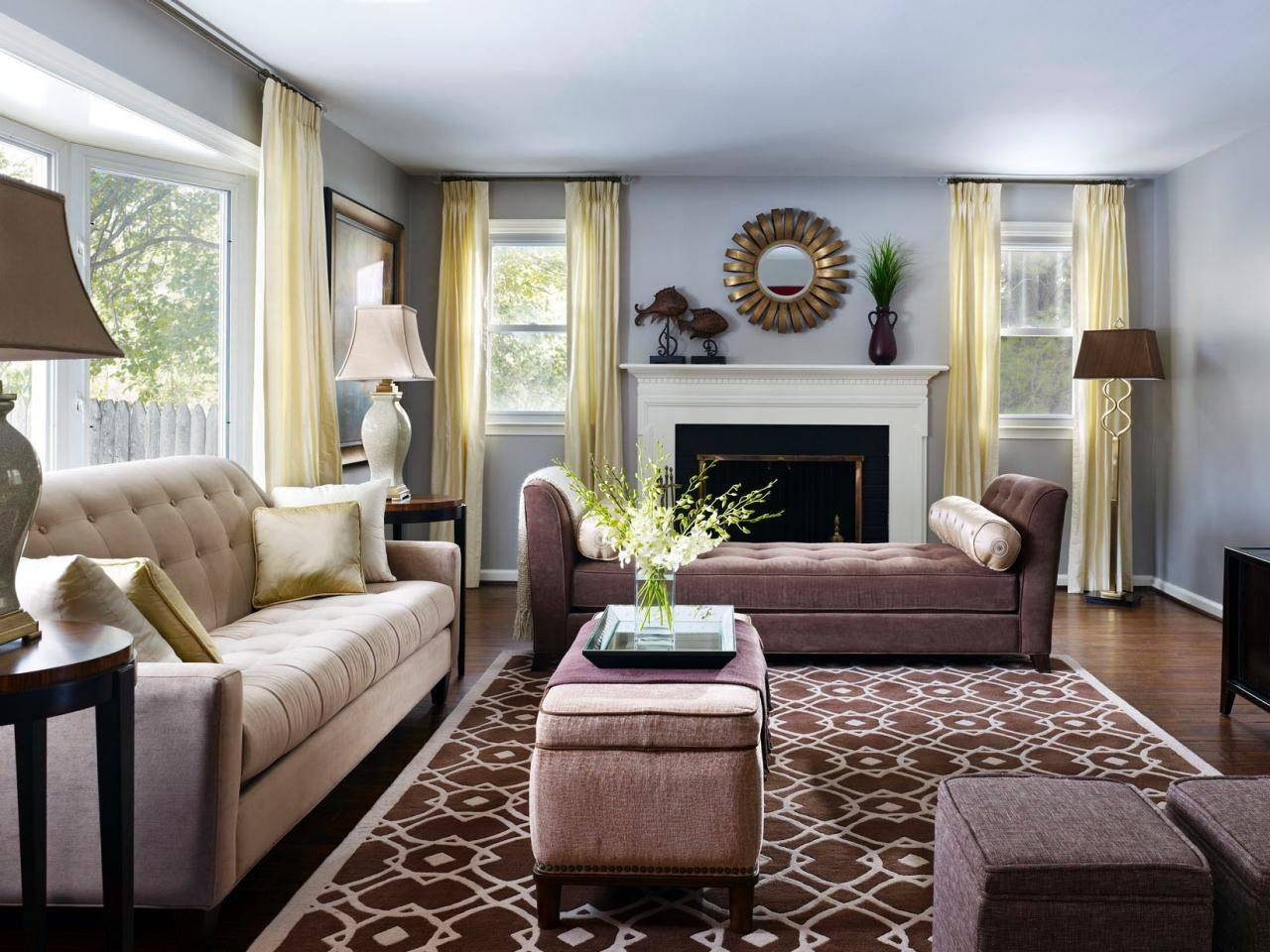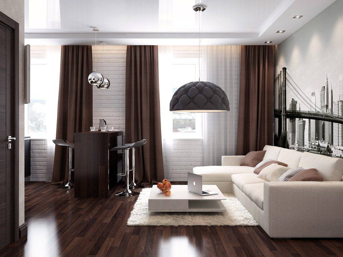 Столь же мягким выглядит интерьер в коричневых тонах. Кроме натуральности, такой цвет придает гостиной шик и роскошную атмосферу. Приятные шоколадные стены могут украсить комнату с хорошим освещением и достаточной площадью. Если желание использовать темные оттенки велико, то рекомендуется сначала выкрасить стены, а потом подбирать остальные объекты обстановки. На каждом этапе нужно анализировать свои ощущения от пребывания в гостиной. Если это место не кажется темным, то можно считать, что детали подобраны верно.