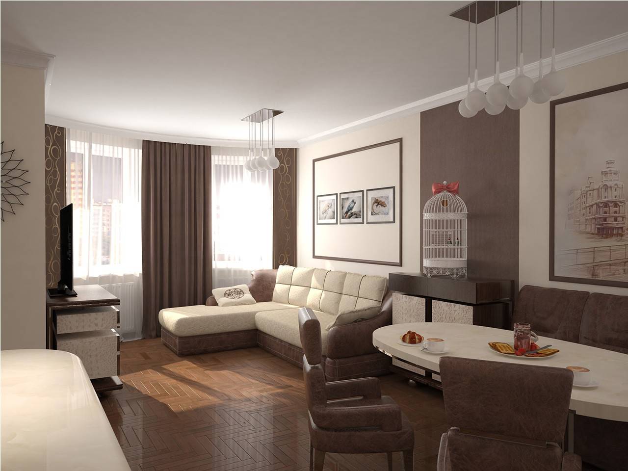 Гостиную можно оформить так – стены покрасить разбеленным цветом какао, для чего смешиваются коричневая и белая краски. Шторы на окнах цвета кофе с молоком. Полы покрыты ламинатом под дерево. Диван и журнальный столик покупают оттенка какао. Обивку у дивана лучше выбрать кожаную. В комнату выбирают 3 комплекта кресел – по 2 в наборе. Один набор кресел имеет молочную обивку, второй – коричневую, третий – комбинированного тона в сочетании коричневого с молочным. Обеденный стол покупают с молочной столешницей. Тумбочка у стены комбинированная – с молочными ножками и коричневой столешницей. Ковры на полу с геометрическим рисунком шоколадной и молочной гаммы. Подушки на диване разного оттенка – в тон основных цветов дизайна. Можно воссоздать этот интерьер и с 3-мя цветами, добавив серый, но это сложнее.
