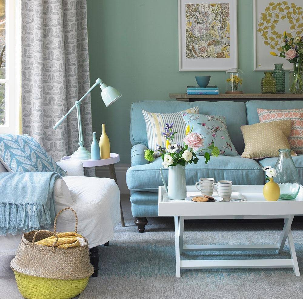 По сравнению с оранжевым или красным, голубой цвет в гостиной — безопасное решение. Это пастельный и расслабляющий цвет, напоминающий голубое небо или море. Цвет успокаивает, но в то же время привносит в интерьер свежесть и немного летнего, теплого климата. Он не бросается в глаза, поэтому с голубым вы можете экспериментировать, сочетая с другими подходящими цветами, не боясь переборщить.