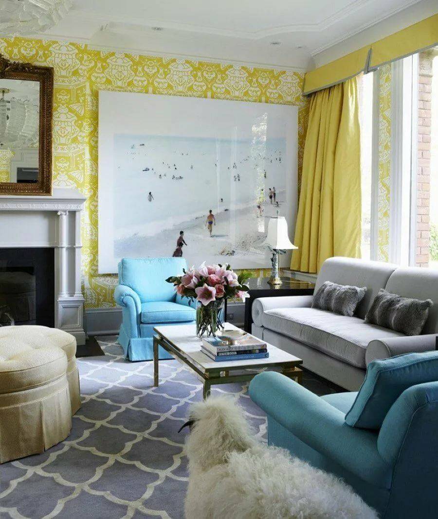 Устоявшаяся цветовая пара — голубой с желтым. Это сочетание является очень популярным и часто используемым. Оно позволяет создать летнее настроение. Желтый, как солнышко, согревает голубую гостиную.