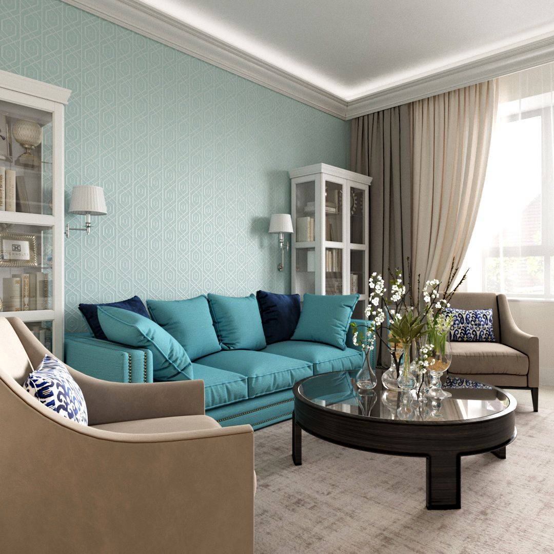 Для гостиной, в которой будут преобладать оттенки голубого, лучше всего подбирать мебель бирюзового, синего, белого или молочного цвета. Мягкие диваны и кресла с декоративными вышитыми подушками станут идеальным решением для такого рода помещения.