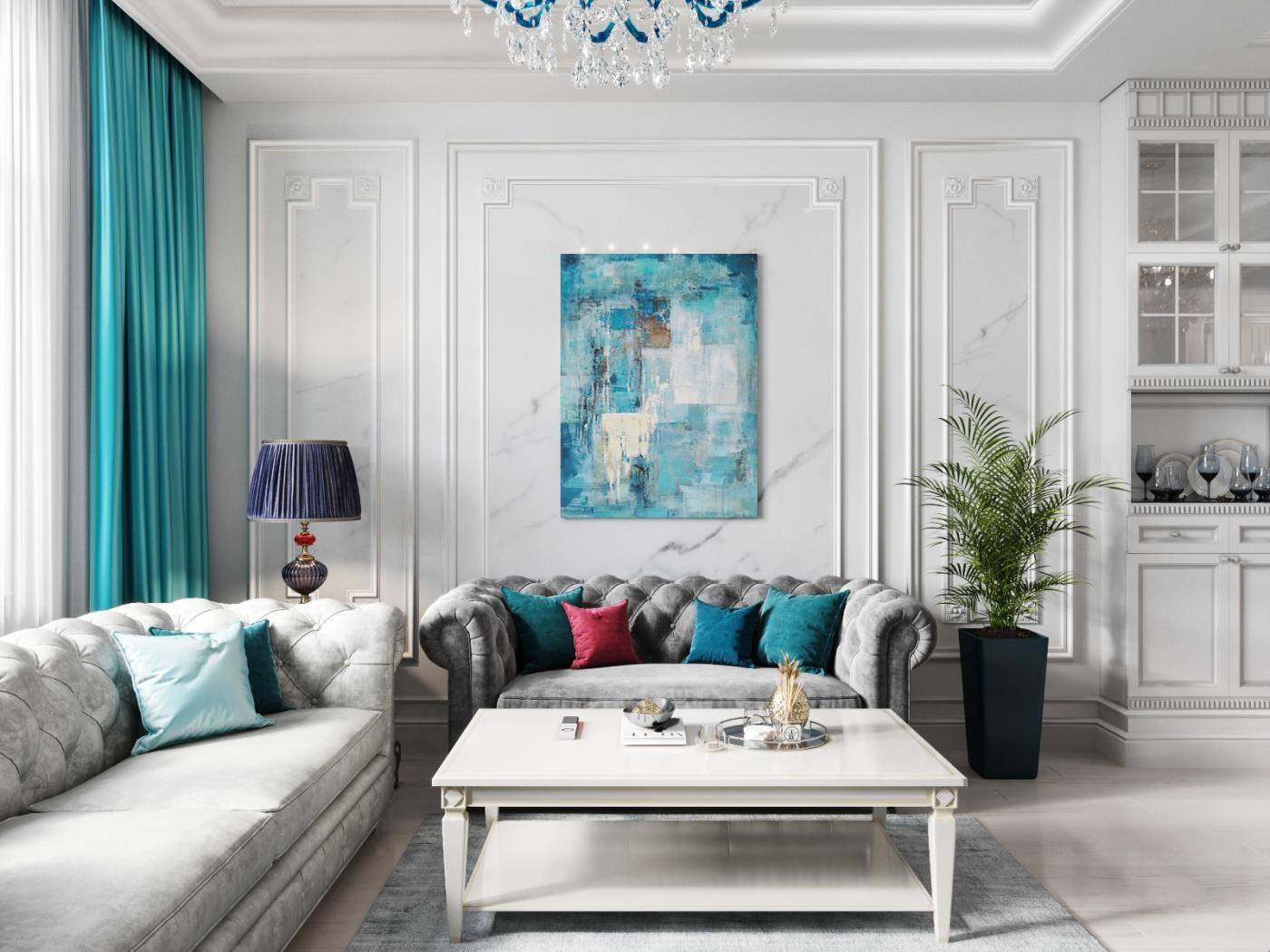 Для чистоты дизайна следует использовать белую отделку для стен, потолка и пола. Мебель также должна быть в светлом, лучше белом цвете. Тогда текстиль, декор, аксессуары, акценты могут быть бирюзовыми или цвета морской волны, что придаст дизайну уникальности и трендовости. К этому сочетанию отлично подойдет третий оттенок – серый, который можно использовать частично в отделке, частично в мебели, например, в качестве основного оттенка обивки дивана.