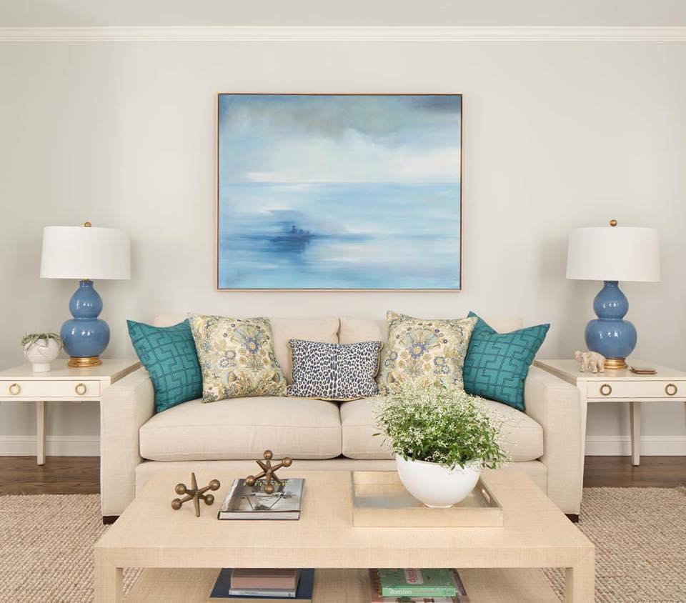 - Комбинирование нескольких тонов голубизны придадут гостиной романтический вид.