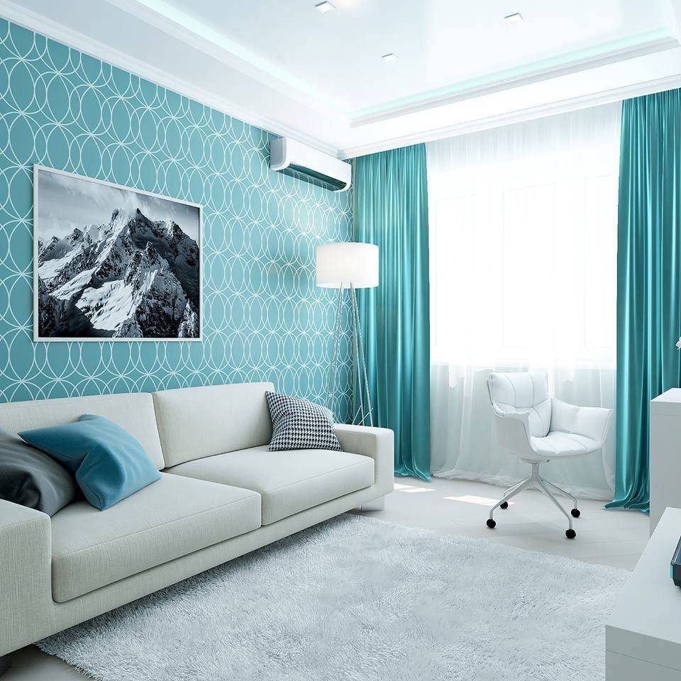 - голубой и белый. В тандеме такие оттенки олицетворяют свежесть и чистоту, поэтому прекрасно подходят для оформления ванной и кухни. В спальне такие комбинации позволят расслабиться, в детской – успокоят вашего ребенка, а в рабочем кабинете – настроят на умственный труд. Можно подобрать обои со светлыми узорами: например, голубые обои с белыми цветами наполнят чувственностью любой интерьер и станут главным акцентом. Если благородные комбинации белого и голубого кажутся вам слишком банальными, можете добавить в такой интерьер несколько похожих оттенков: кремовый, кофейный, бежевый или бирюзовый;