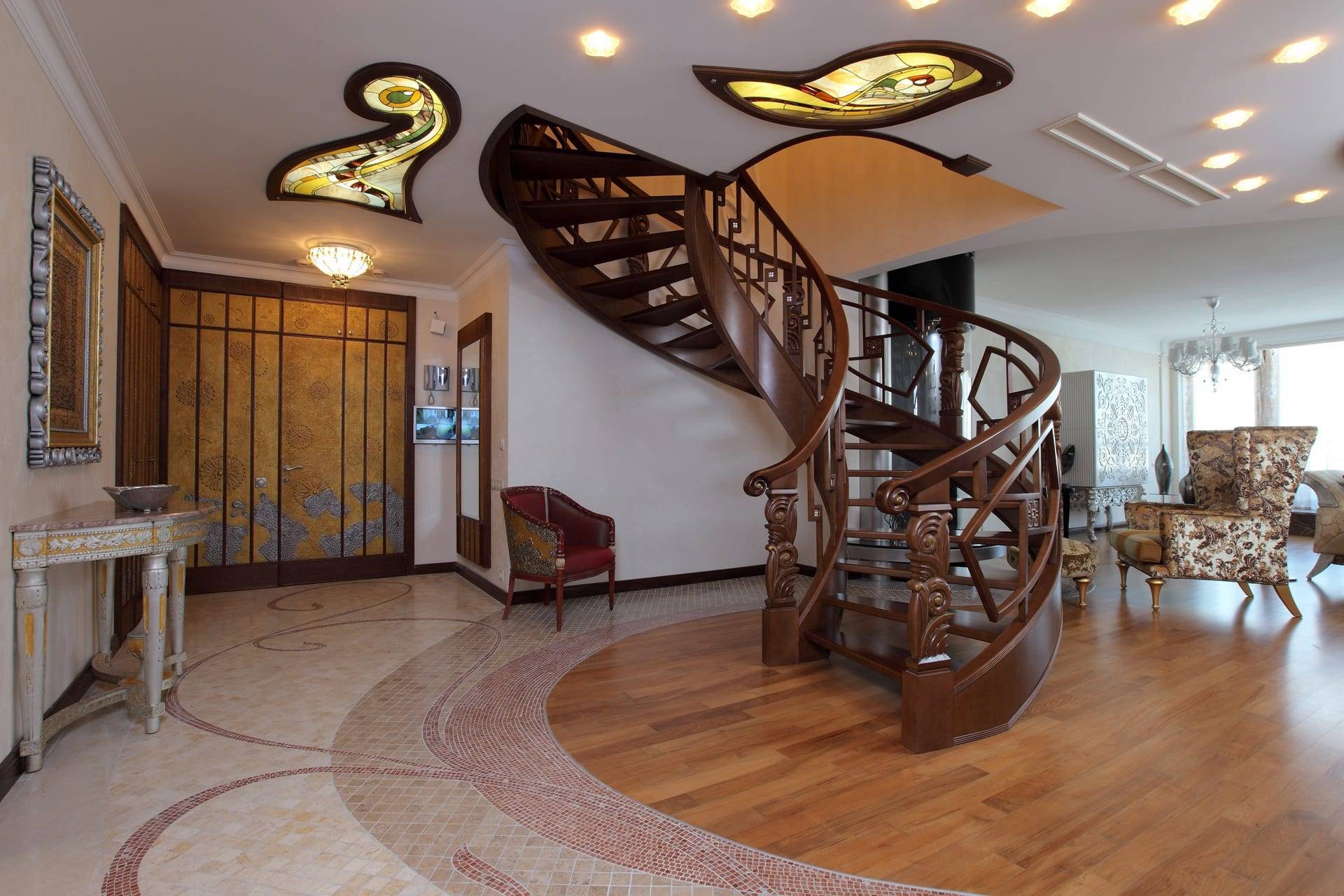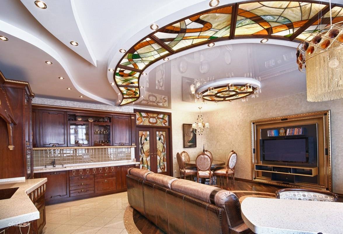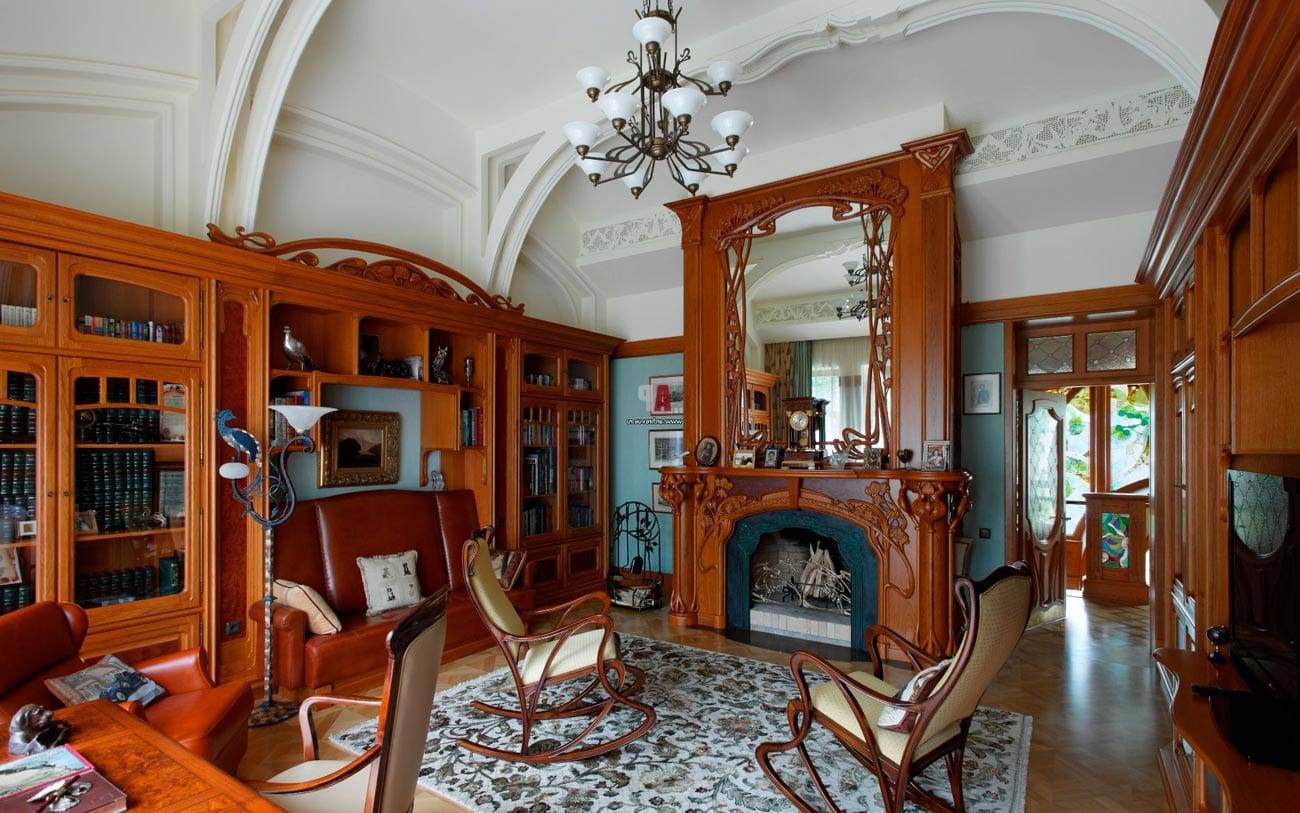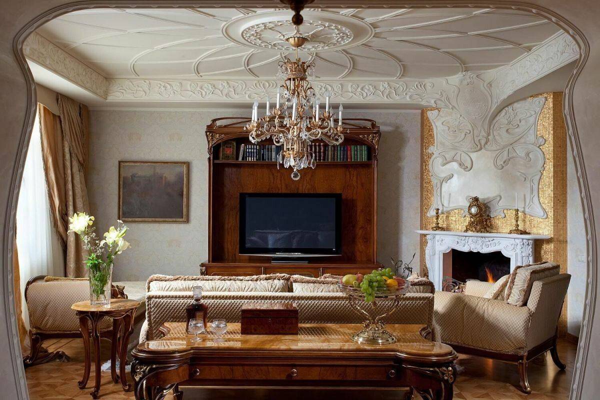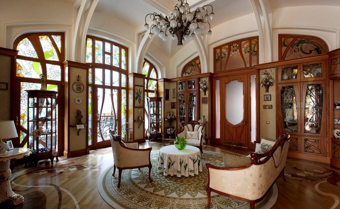 Потолки, как правило, украшают гипсовой плоской лепниной с растительным орнаментом или декорируют самыми разными по форме, размеру, фактуре и оттенкам витражами. Для стиля модерн считается характерным использовать неяркое освещение, придающее интерьеру романтическое настроение и уют.