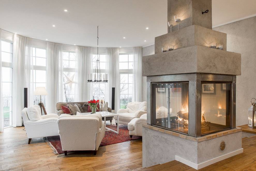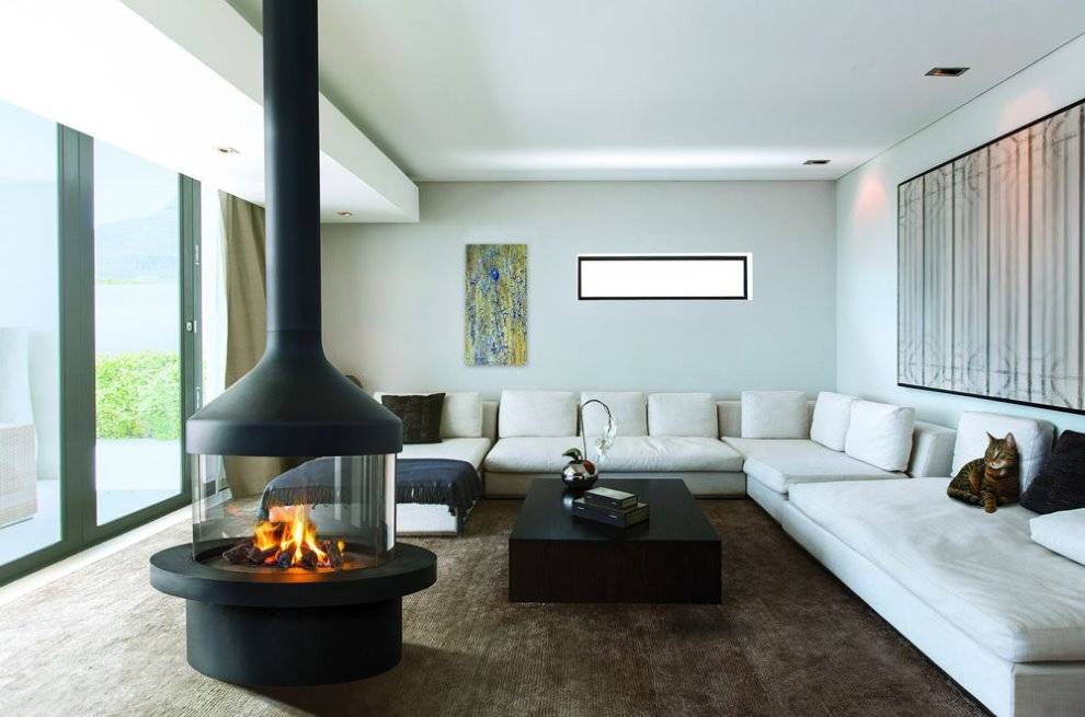 Камин такой формы смотрится очень эффектно, но требует пространства