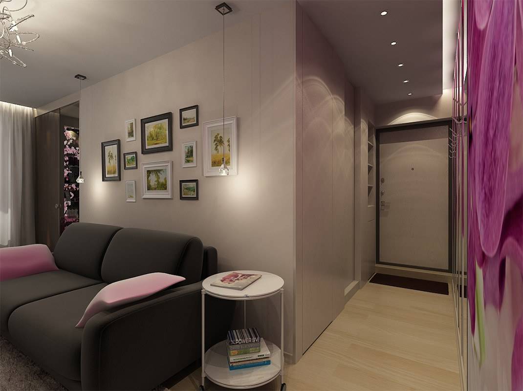Объединение прихожей и гостиной может неплохо расширить пространство квартиры. В этом случае более приглушенное освещение будет уместно в зоне прихожей, а большое зеркало дополнительно увеличит пространство и принесет пользу жильцам, собирающимся на выход.