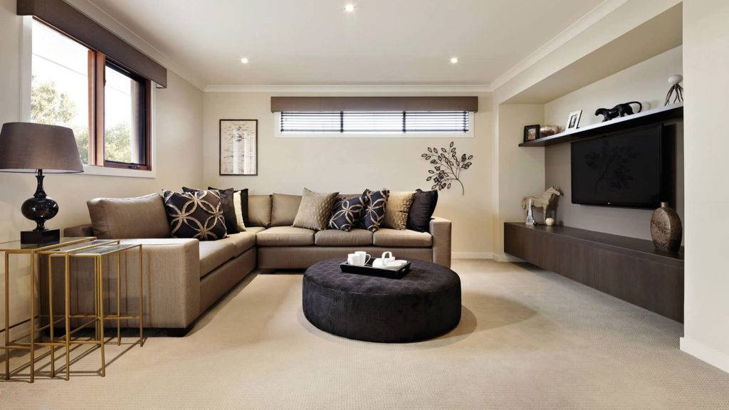 Гостиная, оформленная в бежево-коричневых тонах, уже давно стала классикой, поскольку заявленный цвет может быть как теплым кремово-бежевым, так и персиковым, цвета слоновой кости и даже ореховым и цвета какао.