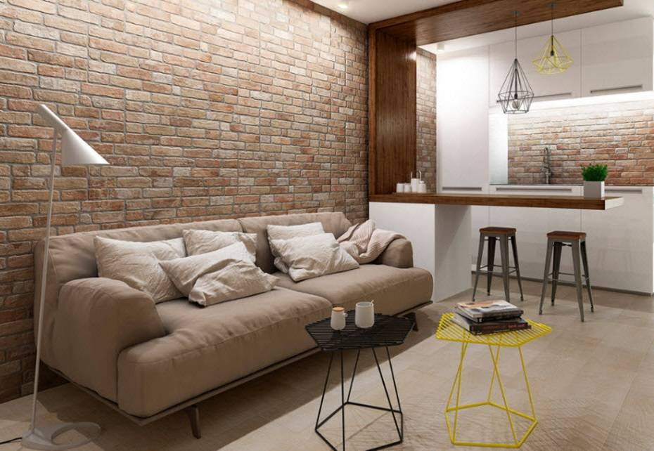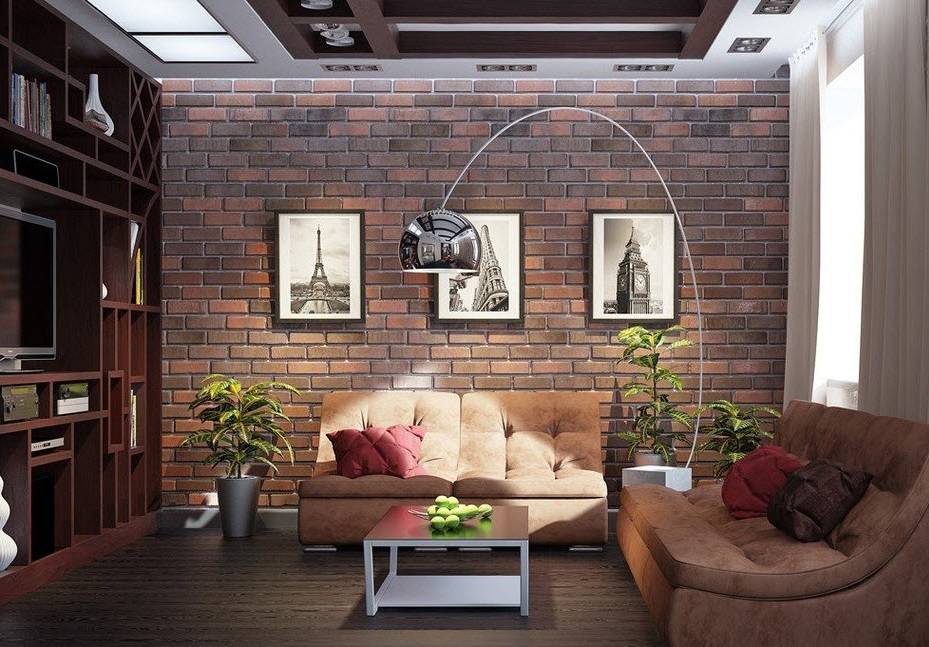 Главную роль при воссоздании лофта в гостиной играет облицовка: