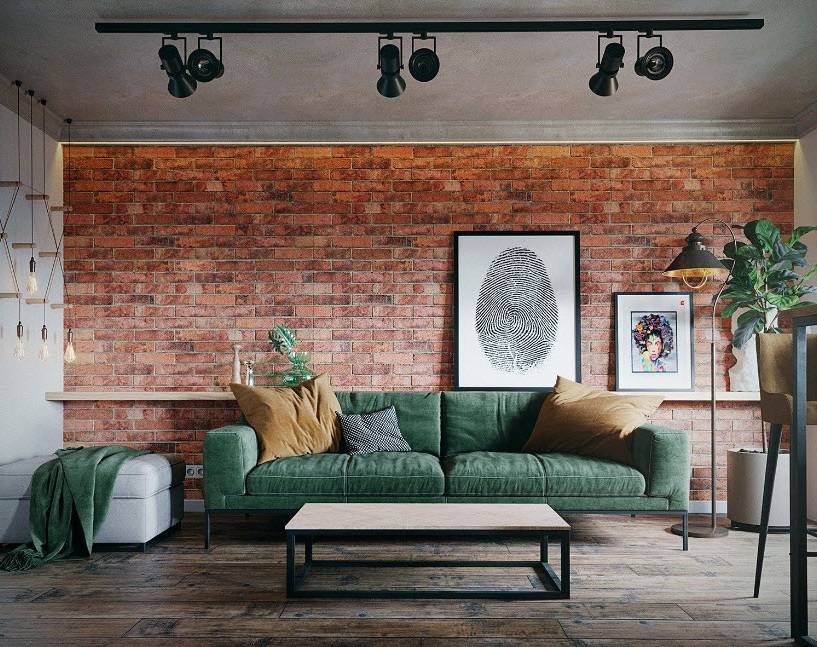 Можно использовать любой оттенок – от белого, до темно-красного. Чем большая площадь стены оформлена кирпичной кладкой, тем светлее должен быть цвет. Подойдет «пыльный» оттенок красного или коричневого: он не раздражает глаз при наличии других ярких декоративных элементов. Кладка насыщенного цвета подойдет для одной стены или декорирования колонн в гостиной. При необходимости можно покрасить кирпичную фактуру.