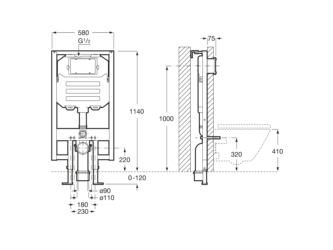 Roca Duplo WC Compact – ширина 580 мм, высота 1140 – 1260 мм, глубина 90 – 110 мм.