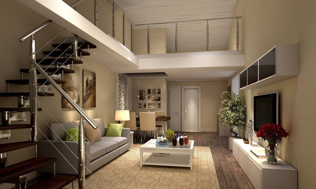 Бежевый и кремовый цвета идеально подойдут для оформления комнаты. Смягчит интерьер гостиной лофт мебель приятного кофейного цвета.