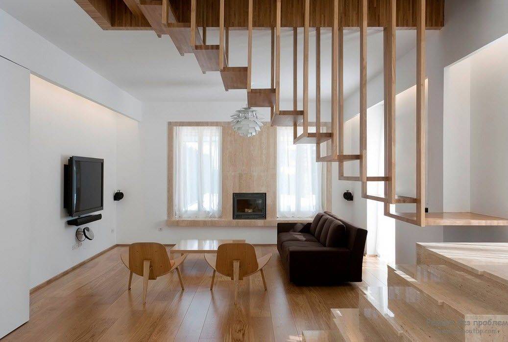 Если строение имеет два или более этажей, то изюминкой нестандартного интерьера может стать лестничная конструкция. Конечно, гостиная с лестницей уже сама по себе смотрится необычно, нужно лишь правильно подчеркнуть или наоборот завуалировать вход на второй этаж.