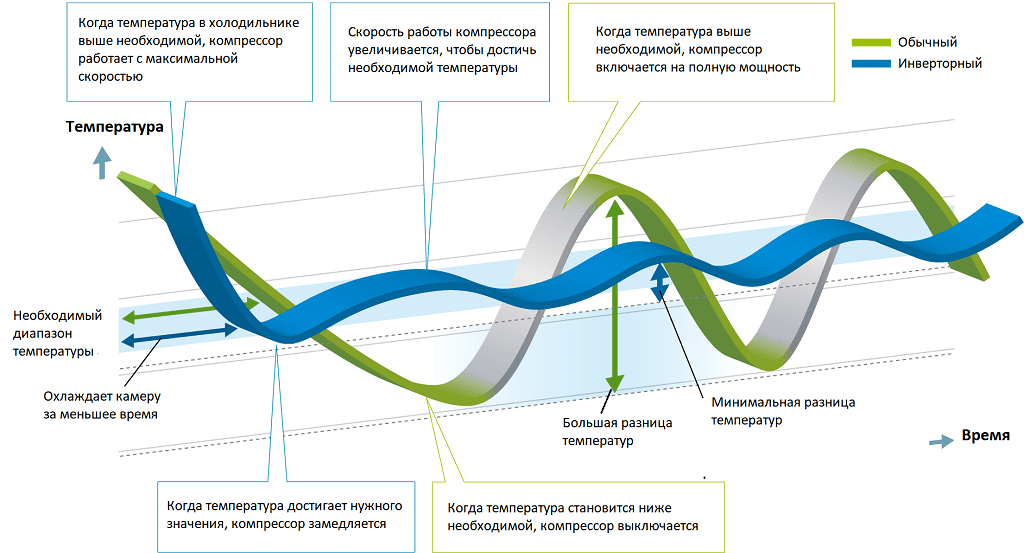 Инверторная система подразумевает плавное регулирование мощности при смене режимов работы устройства. От этого общий принцип работы холодильника не меняется. Датчик при увеличении температуры, подаёт сигнал компрессору о переходе в режим активной работы.