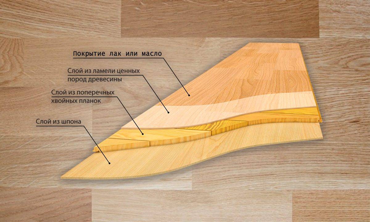 То, что в России принято называть «паркетной доской», представляет собой 3-слойную конструкцию. В основании такого покрытия используется недорогая древесина сосны или березы. Основание выполняется из двух взаимно перпендикулярных склеенных слоев − нижний из продольных планок, а верхний − из поперечных.