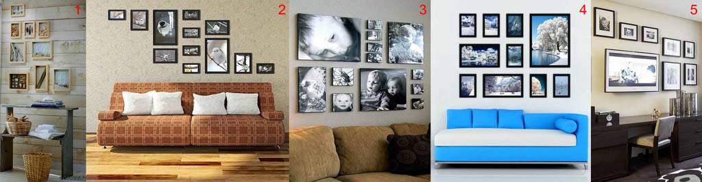 Картины/фото на стенах развешивают в художественном беспорядке в интерьерах классических или традиционных, поз. 1 на рис. В современных интерьерах композиции изображений хорошо смотрятся скомпонованными симметрично. Видимость беспорядка набору картинок можно придать сочетанием нескольких видов симметрии; на поз. 2 – осевая по общему контуру (ромб) и дважды зеркальная по размеру изображений.