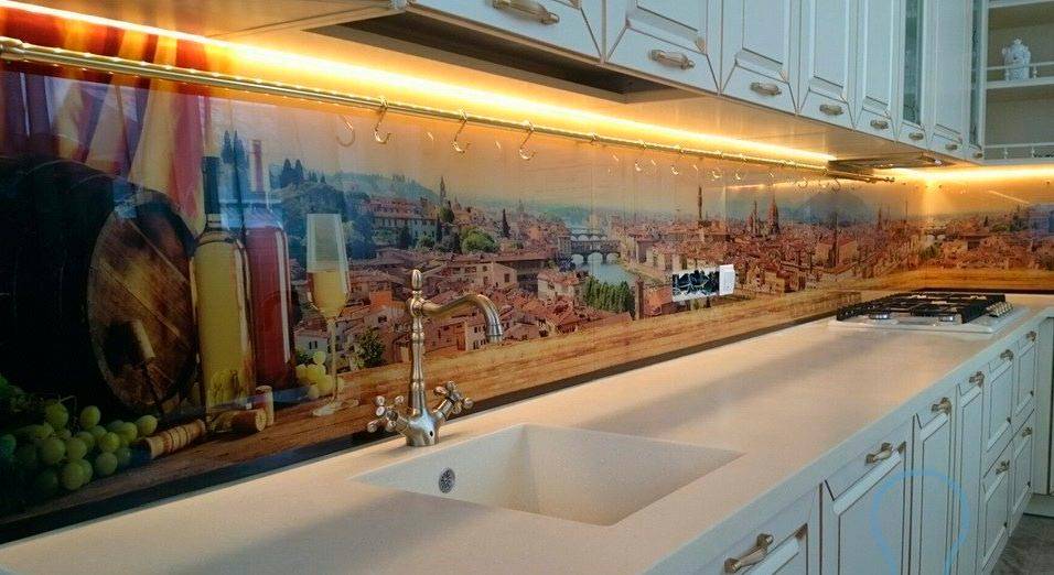 Другое название – скинали. Это один из вариантов сделать фартук необычным. Для печати на кафеле используют рисунки из каталога, принесенные покупателем или готовые панно. Среди вариантов фотопечати – пейзажи, тема еды, необычные орнаменты и абстрактные картины. Не обязательно размещать фотоплитку на всю стену.