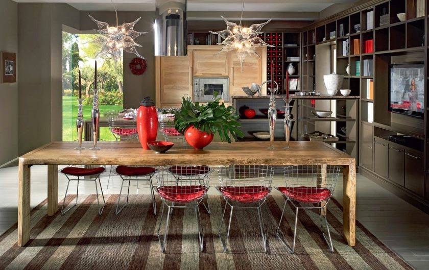 В итальянском стиле в интерьере будет уместно зонировать территорию. Например, шикарный деревянный стол можно отделить половой плиткой от окружающего пространства. Диван и кухонный гарнитур выполнить из натуральных материалов, взять для декорирования стен и пола массив дерева. В таком помещении хорошо будет смотреться деревянная или кованая мебель.