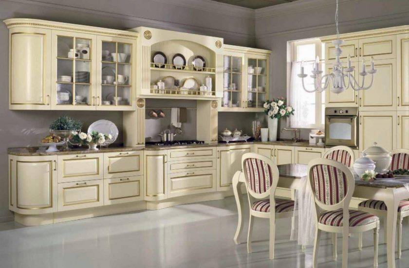 Мебель на кухню выбирается весьма аккуратно. Столешница должна быть мраморной, шкафы украшенные резьбой, фурнитура очень красивая. Стол также нужно покупать в этом стиле, что вся мебель.