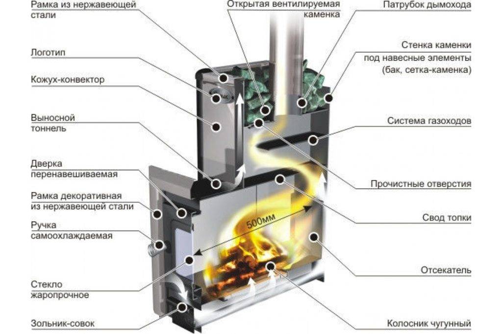 По сути, камин является печью с открытой топкой. Поленья дров сгорают и выделяют тепло, что и является источником обогрева. Чтобы дым не попадал в комнату, предусмотрен дымоход изогнутой формы. Он же препятствует попаданию извне в очаг дождя и снега.