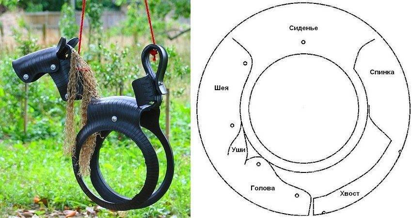 Также используют покрышки (как целиком, так и разрезанные на куски). Цельный вариант хорош своей простотой — подвязать веревку и можно кататься. С точки зрения эстетики, удобства подойдет сборная модель — нарезанная на куски различных форм, соединенных заклепками.