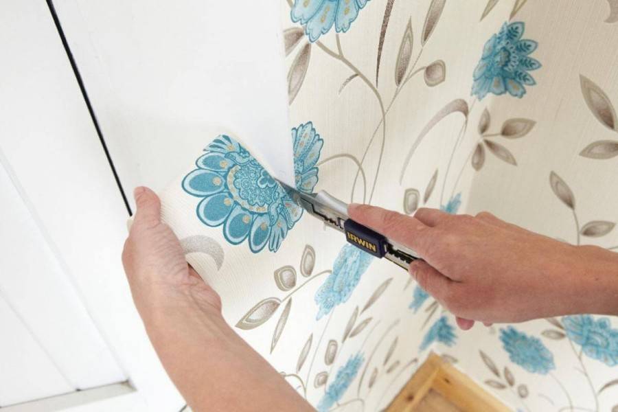 Когда обоина приклеена, нужно прорезать стык и удалить ненужную полоску.