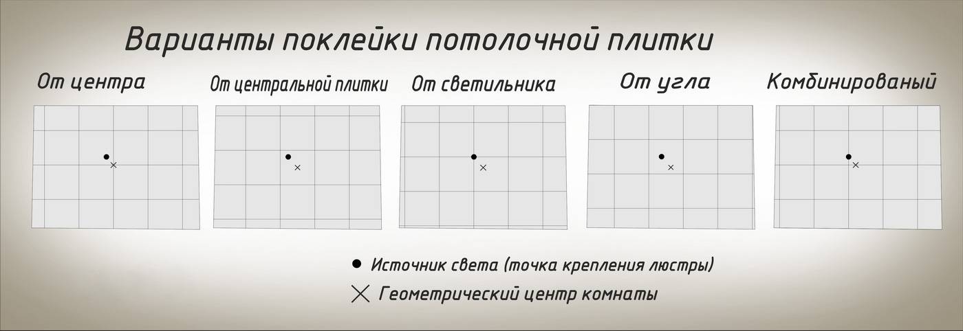 Выбор укладки зависит от формата помещения. Просматривая вариант, как клеить плитку на потолок, нужно выбирать технологию, исходя из опыта. Вот несколько самых доступных схем: