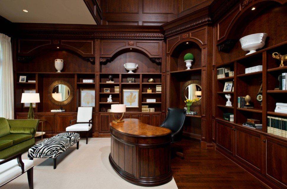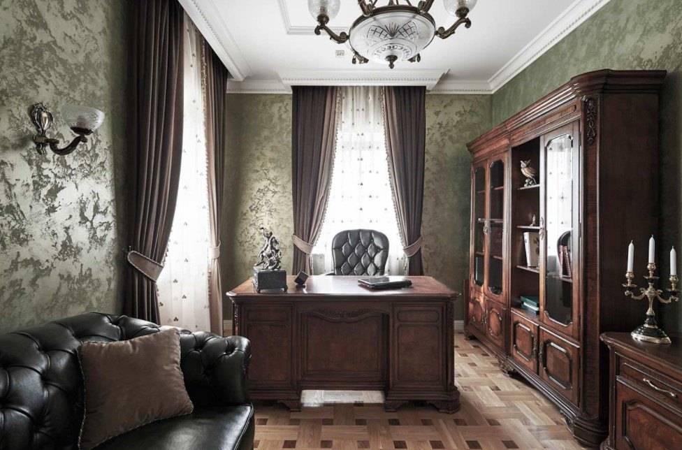 Классический дизайн кабинета в доме предполагает наличие тяжелого стола-секретера, удобного стула и спокойной обстановки.