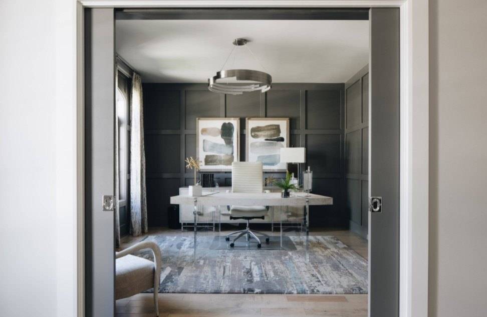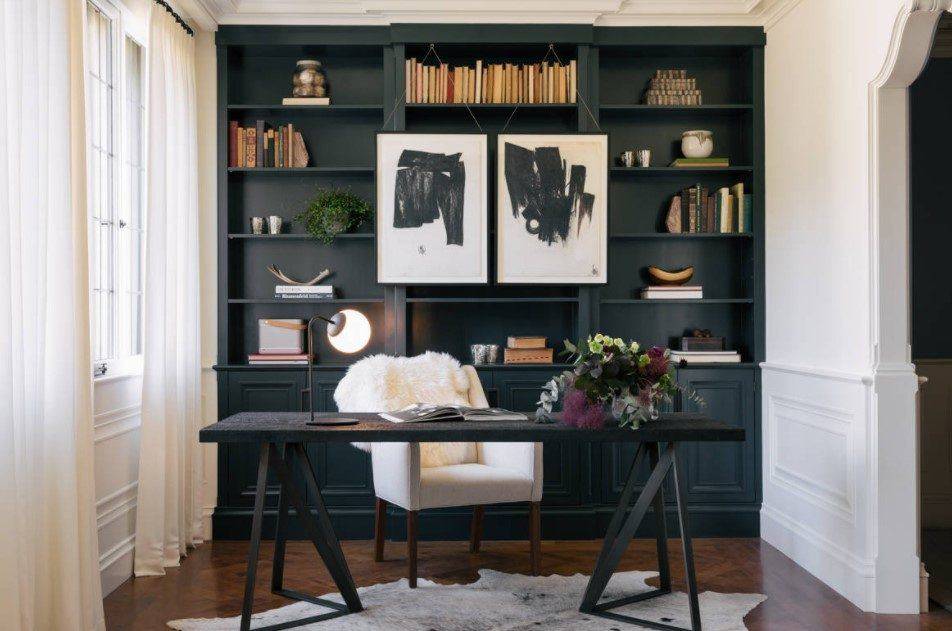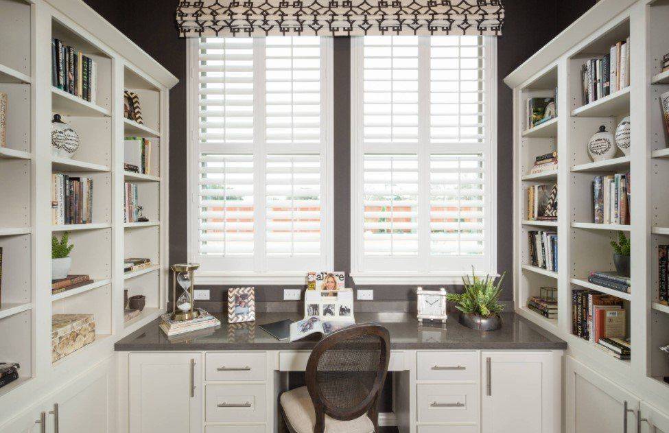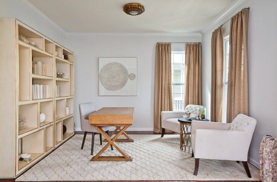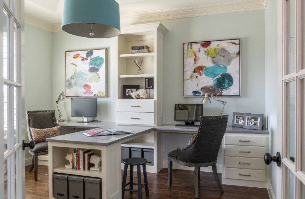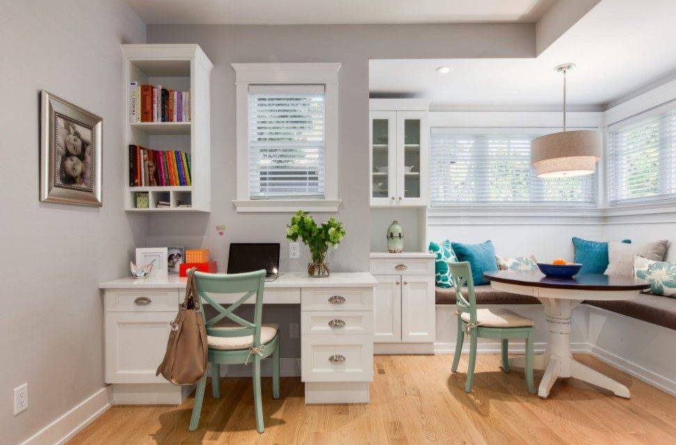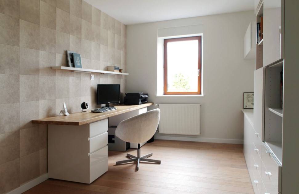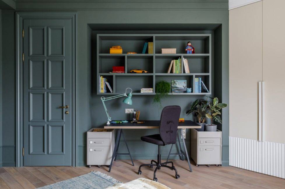 Для оформления рабочей зоны традиционно используют спокойные нейтральные цвета: белый, светло-серый, беж. Популярны также легкий светло-зеленый и оттенки синего. Считается, что они способствуют концентрации внимания.