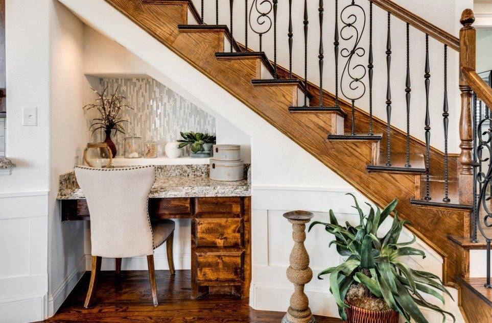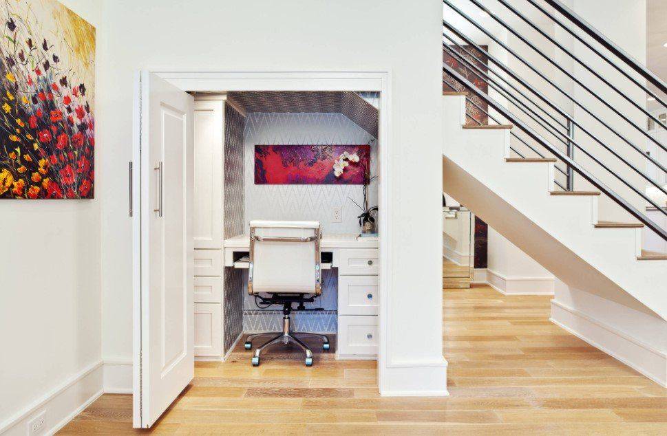 Если речь идет не об отдельном домашнем кабинете, а о небольшой «выделенке», то очень удобно оборудовать мини-офис в нише или каком-нибудь «закутке». Это позволяет естественным образом отделить рабочую зону от остального пространства, что способствует лучшей сосредоточенности.