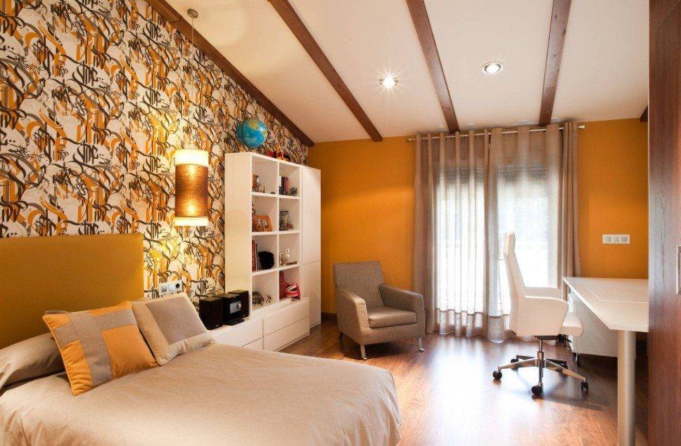 Например, можно поставить рабочий стол перпендикулярно стене. Это, во-первых, удобно, так как столом могут пользоваться одновременно два человека. Во-вторых, стол, стоящий поперек комнаты, позволяет разделить зоны. Допустим, все, что располагается со стороны сидящего за столом — это кабинет, а все, что напротив — зона гостиной или спальни. В-третьих, такое расположение позволяет наиболее рационально задействовать площадь комнаты, расположив у стен больше нужных предметов мебели и техники.