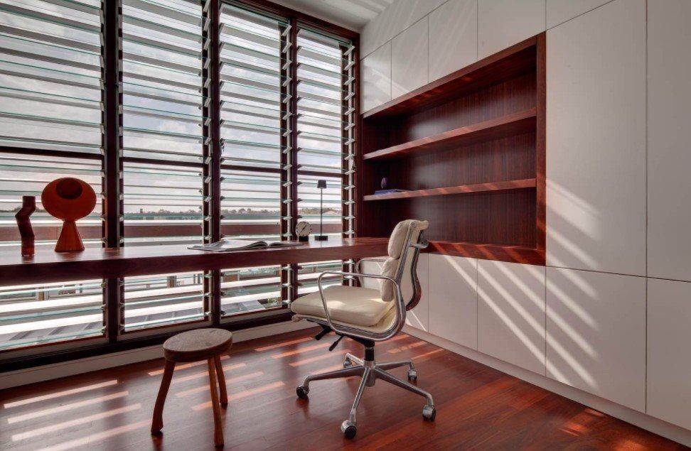 Обратите внимание на дизайн этой замечательной гостиной. С первого взгляда и не понять, что на фото — гостиная с рабочим местом