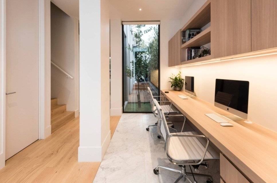Преимущество данного варианта организации рабочего места в том, что для узкого столика место найти проще — можно задействовать гостиную, коридор, холл, кухню, лоджию.