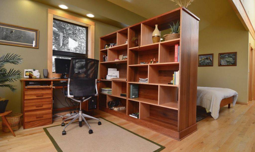 Деревянный или гипсокартонный стеллаж позволит создать выделенный уголок. Конечно, это не обеспечит достаточной изоляции и тишины для трудового места, но вот уменьшение объема помещения произойдет. Причем на получившиеся полки лучше поставить книги, папки и другие атрибуты настоящего кабинета.