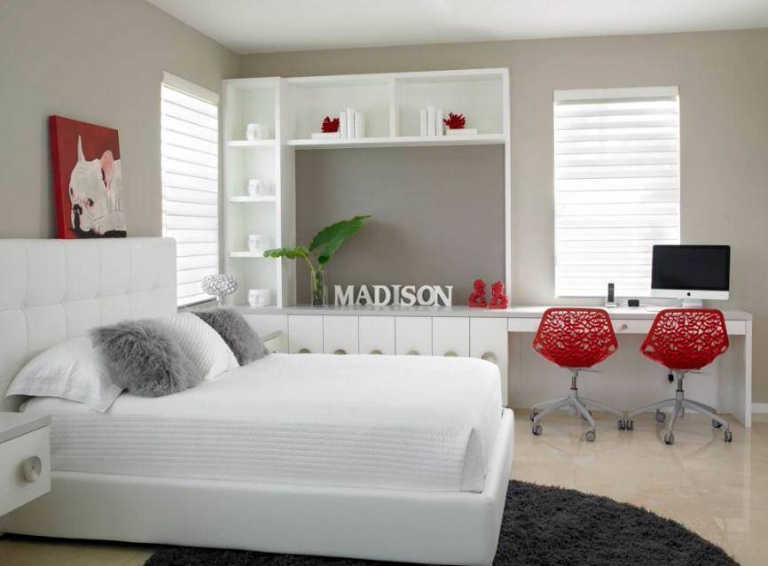 Тотальный ярко-красный, глубокий фиолетовый и другие интенсивные цвета приводят к быстрому переутомлению, но они хороши в качестве небольших акцентов. Стул и пара таких аксессуаров в рабочей зоне сделают дизайн помещения более живым. Главное, чтобы эти цветовые пятна нашли отклик в общей палитре гостиной.