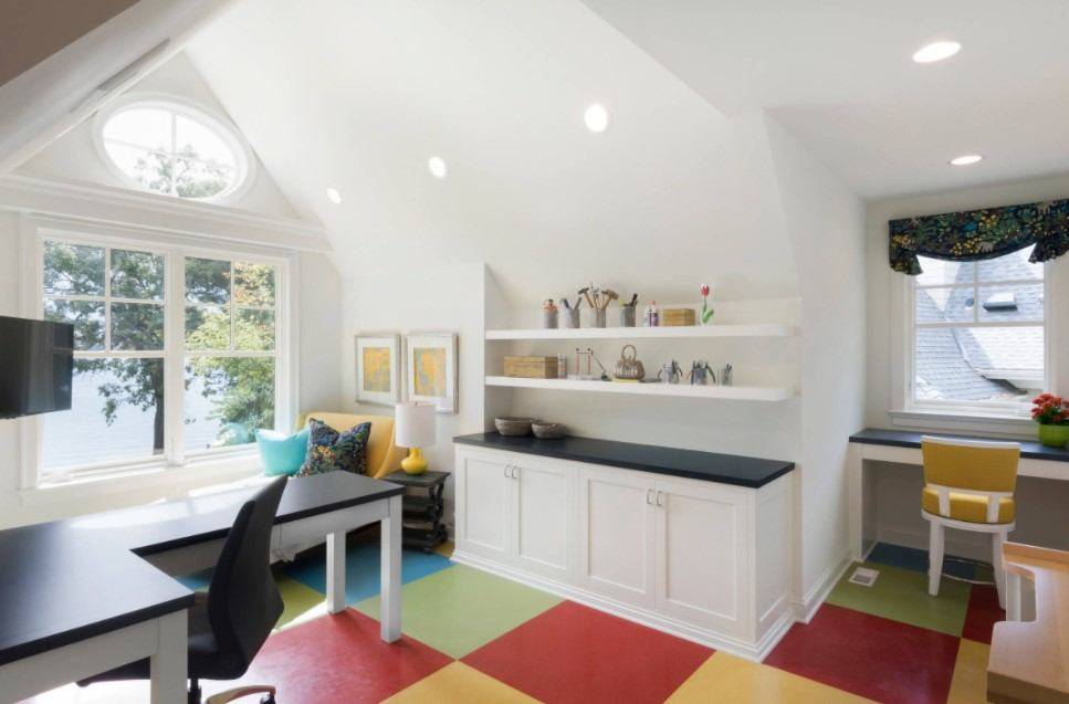 Если нет возможности сделать пространство у окна или в его сторону, то важно обеспечить это место достаточным освещением. Плюс к потолочному, рекомендуется установить местное освещение в виде настольной лампы