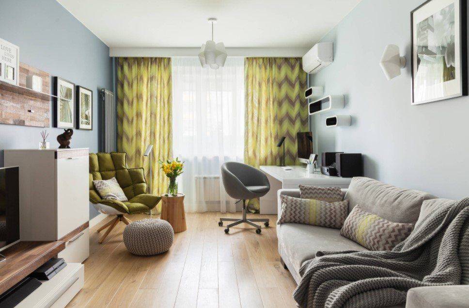 Рассмотрим несколько вариантов грамотного совмещения рабочего пространства и зоны отдыха в гостиной: